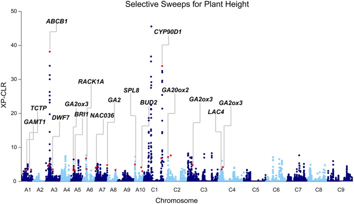 Plant height is a key morphological trait of rapeseed. In this study, we measured plant height of a rapeseed population across six environments. This population contains 476 inbred lines representing the major Chinese rapeseed genepool and 44 lines from other countries. The 60K Brassica Infinium® SNP array was utilized to genotype the association panel. A genome-wide association study (GWAS) was performed via three methods, including a robust, novel, nonparametric Anderson-Darling (A-D) test. Consequently, 68 loci were identified as significantly associated with plant height (P < 5.22 × 10(-5)), and more than 70% of the loci (48) overlapped the confidence intervals of reported QTLs from nine mapping populations. Moreover, 24 GWAS loci were detected with selective sweep signals, which reflected the signatures of historical semi-dwarf breeding. In the linkage disequilibrium (LD) decay range up-and downstream of 65 loci (r (2) > 0.1), we found plausible candidates orthologous to the documented Arabidopsis genes involved in height regulation. One significant association found by GWAS colocalized with the established height locus BnRGA in rapeseed. Our results provide insights into the genetic basis of plant height in rapeseed and may facilitate marker-based breeding.